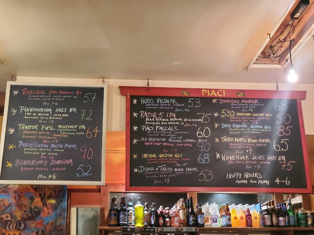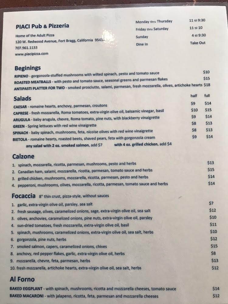 Welcome to Piaci | Pub & Pizzeria, your go-to destination in Fort Bragg for delicious thin-crust pizzas, calzones, and fresh salads, all crafted from the finest ingredients. Enjoy our inviting atmosphere while savoring a diverse selection of local and regional beers and wines. Perfect for lunch or dinner, our menu features vegetarian-friendly options and delightful baked specialties. With quick service and ample seating, including wheelchair accessibility, Piaci is ideal for everyone. Don’t miss our “happy hour” discounts on drinks! Visit us at 120 W Redwood Ave, or call +1 707-961-1133 for takeout or delivery.